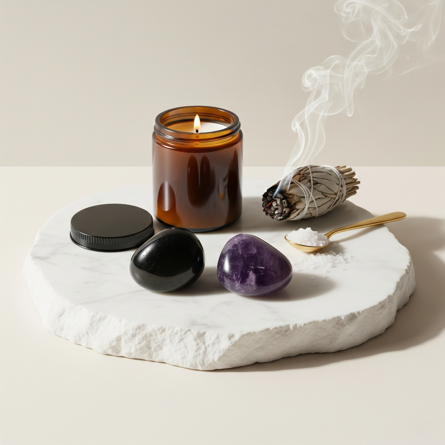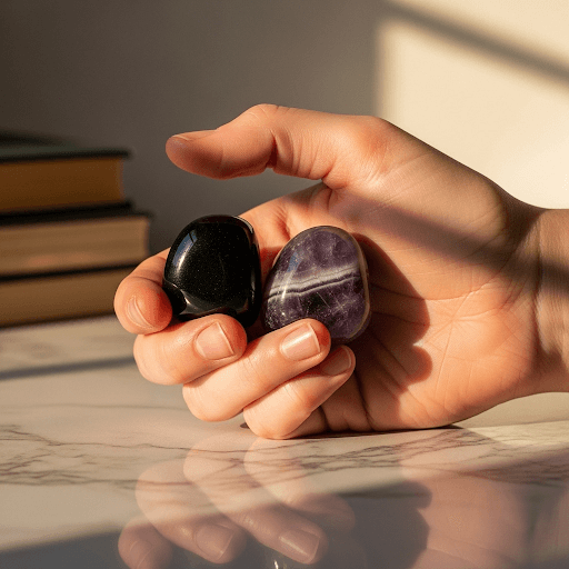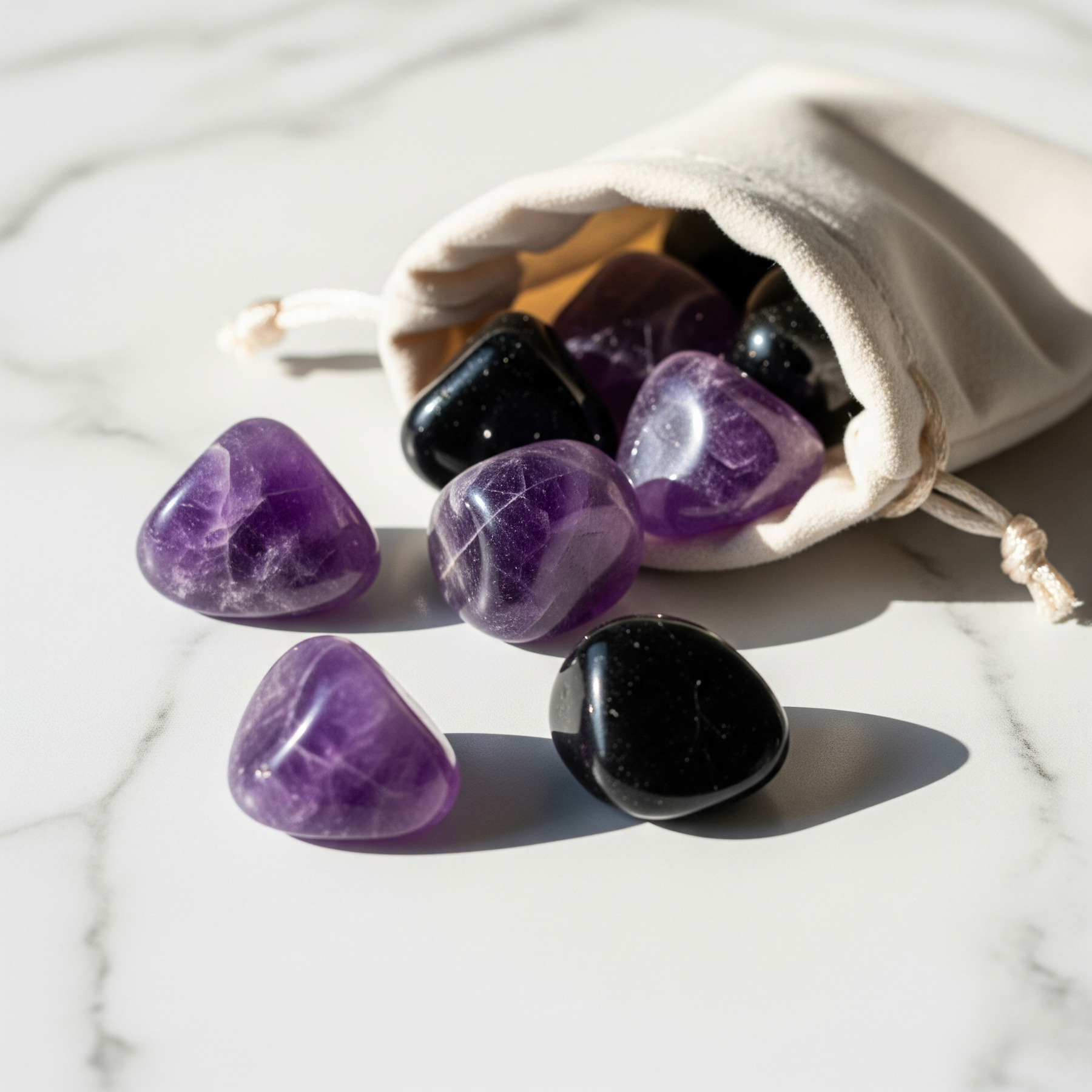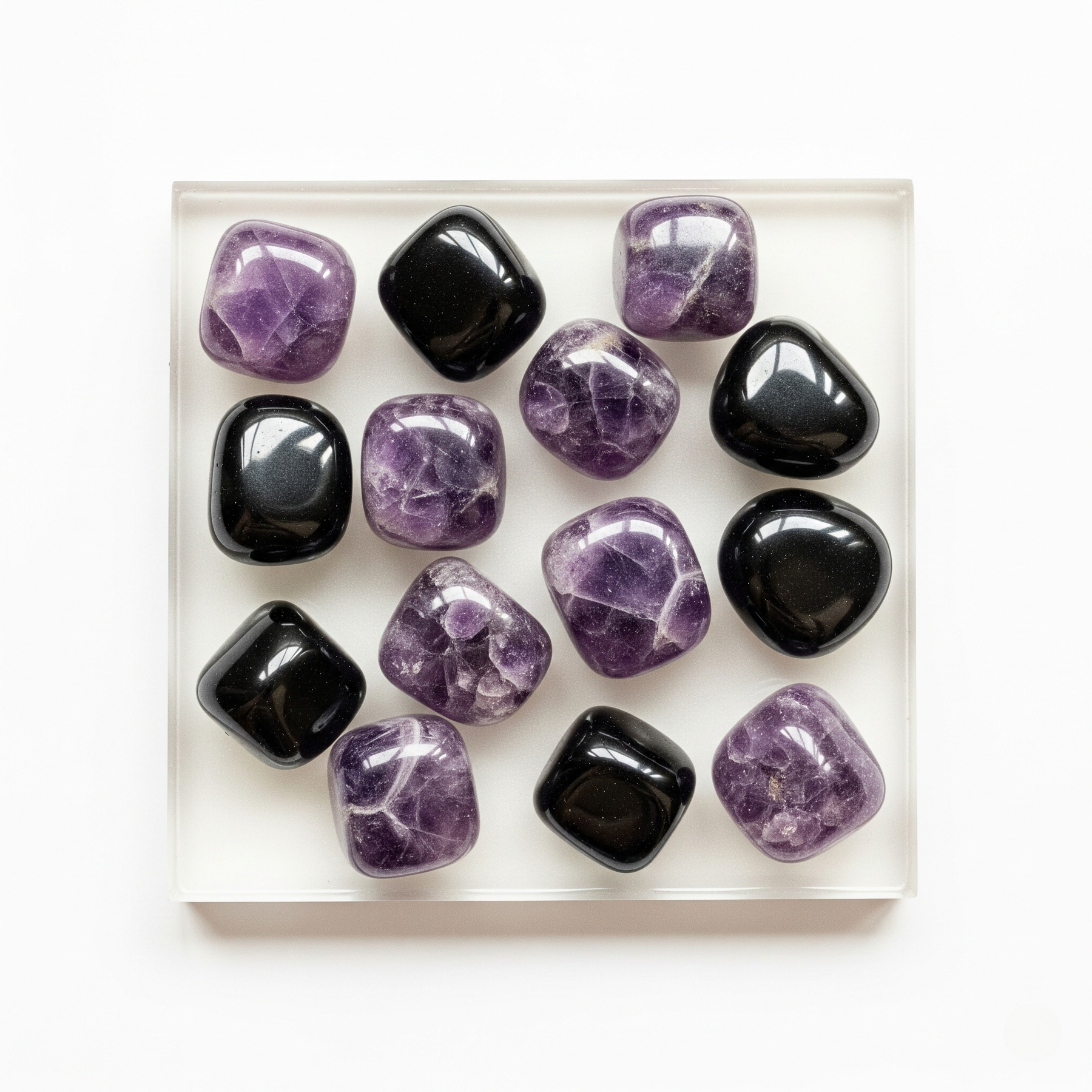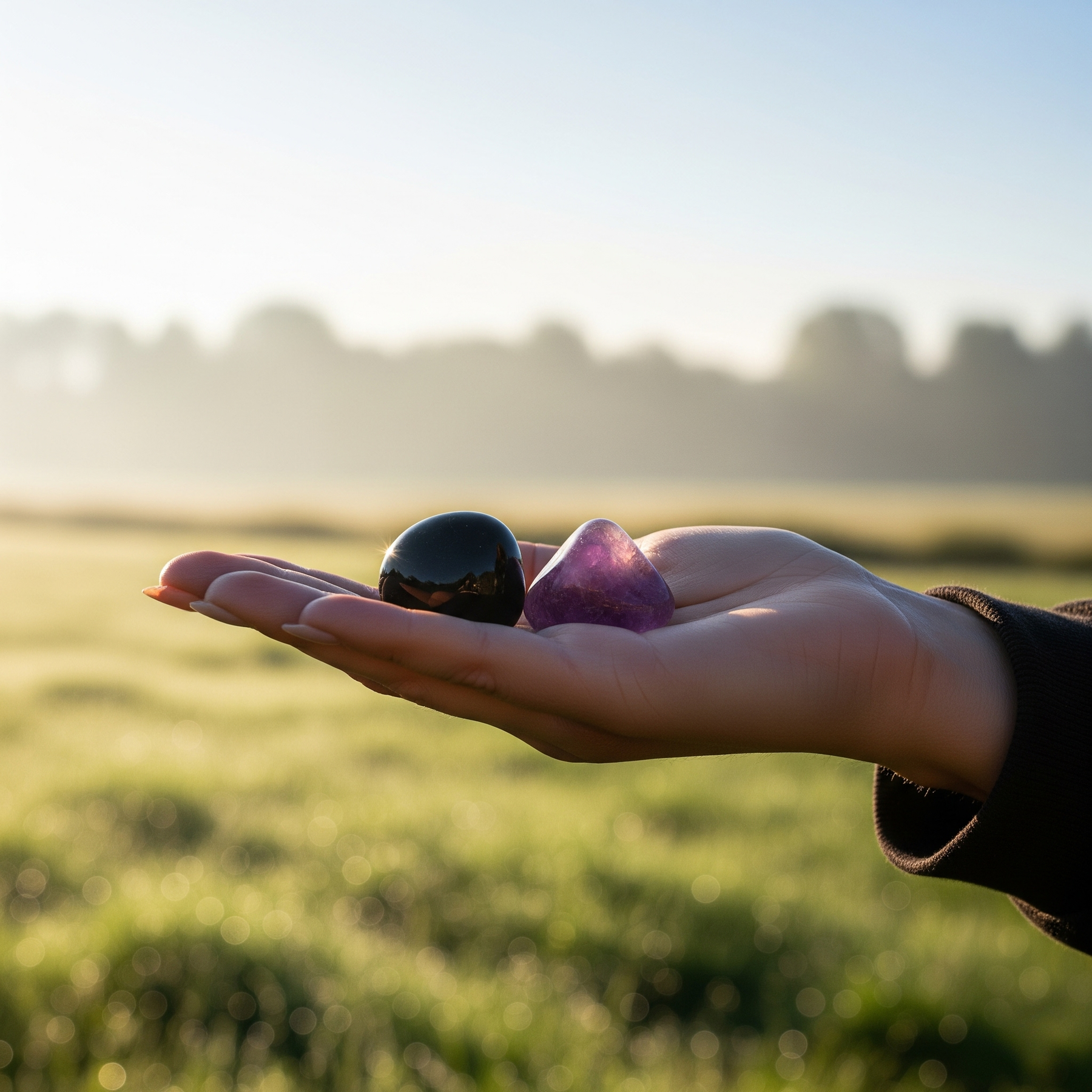 Czarny obsydian tworzy barierę energetyczną, wzmacnia Twoje granice psychiczne i pomaga Ci zachować spokój w sytuacjach tego wymagających. Ametyst stabilizuje emocje i pomaga zachować racjonalne podejście, kiedy świat wokół przestaje być przewidywalny. Ułatwia oddychanie, kiedy pojawia się stres i pozwala reagować z poziomu klarowności, a nie lęku.