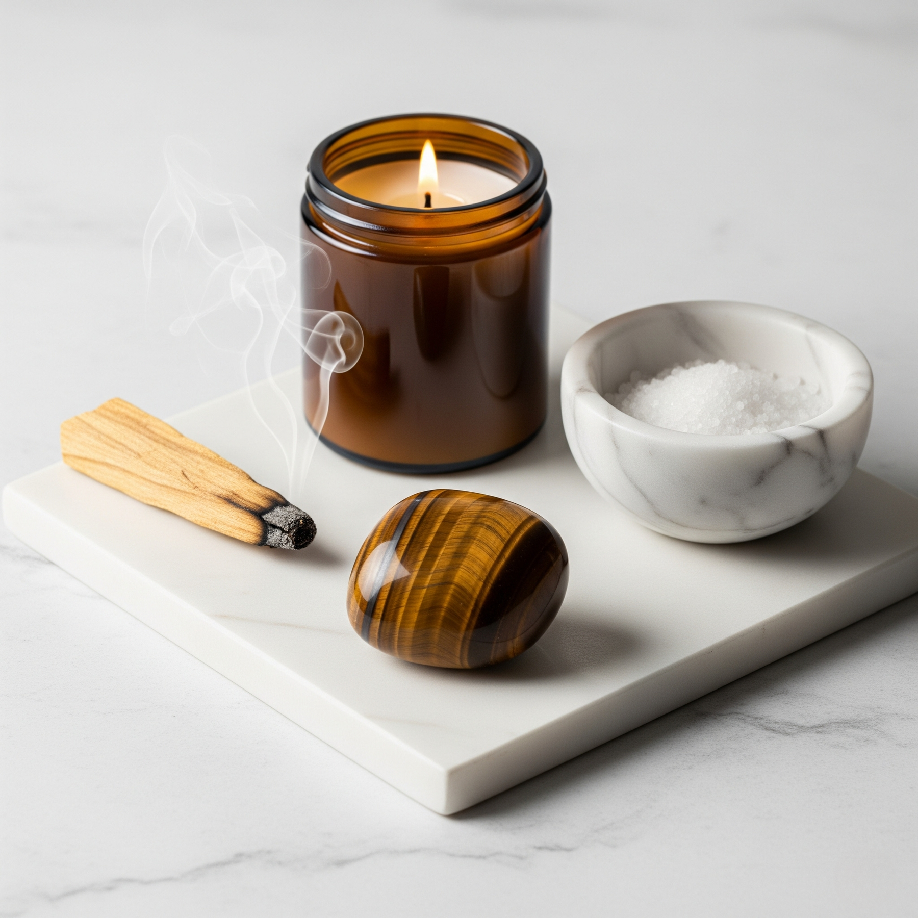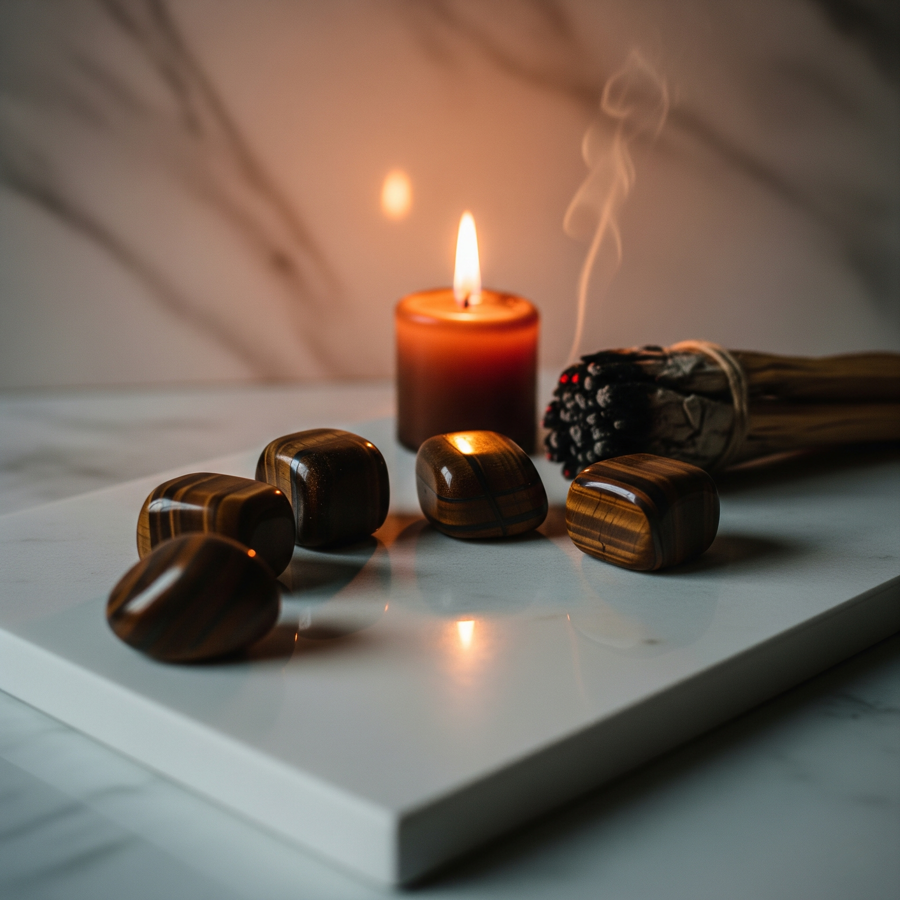 Noś kamień lub umieść go w stałym polu widzenia. Wracaj do intencji w momentach decyzyjnych. Świecę zapalaj, gdy chcesz wzmocnić efekt.
