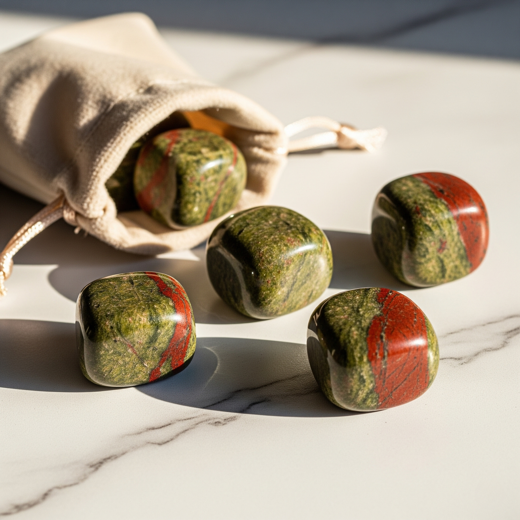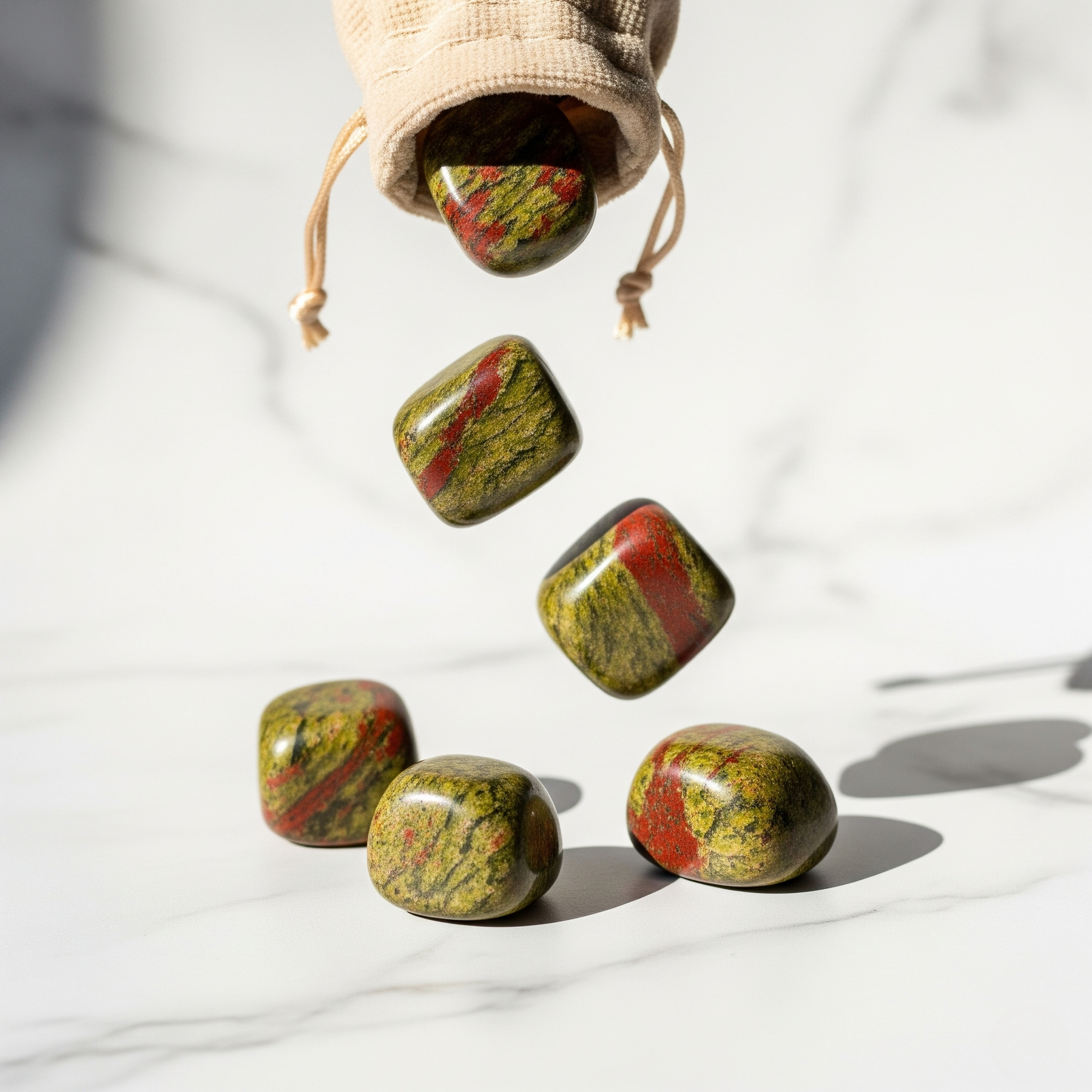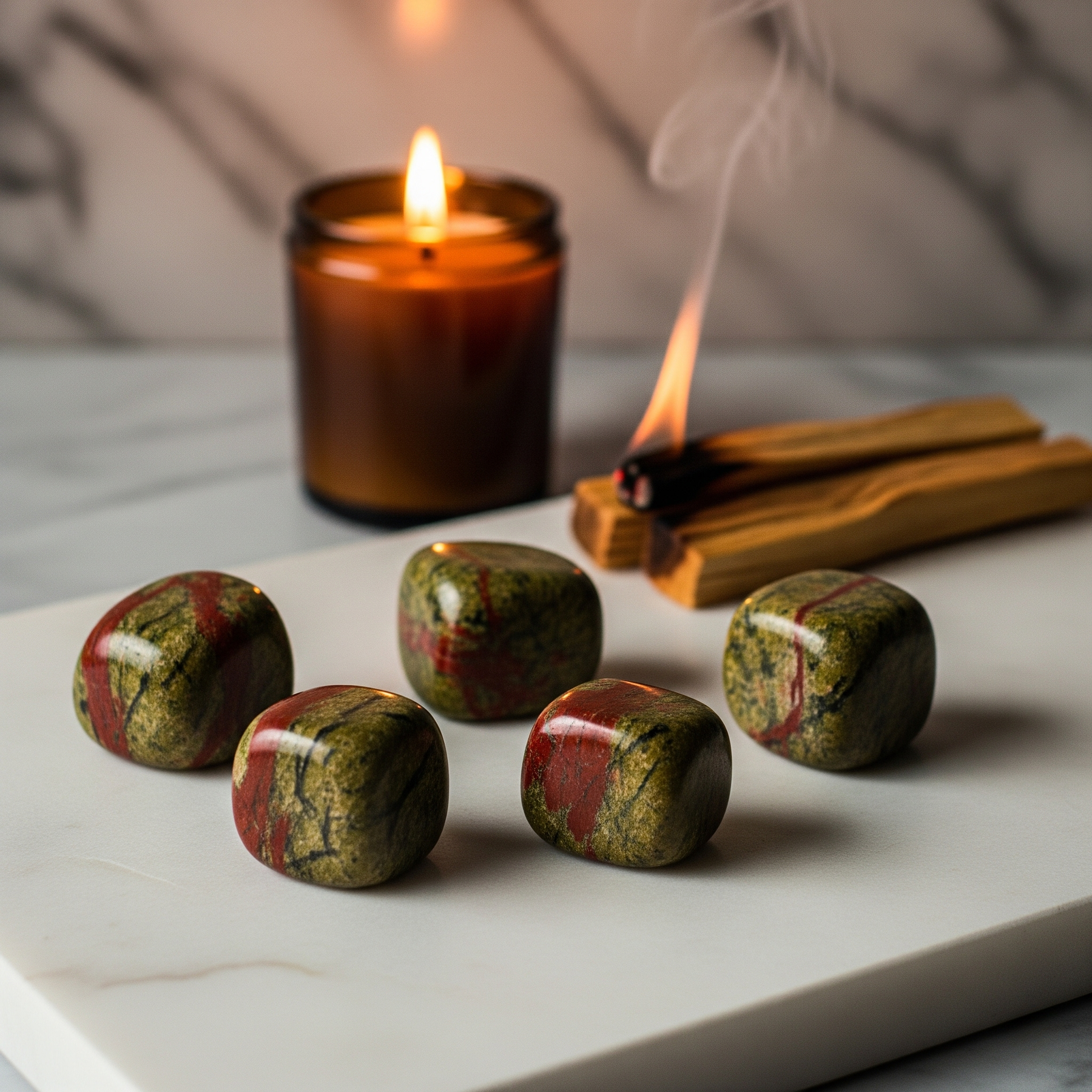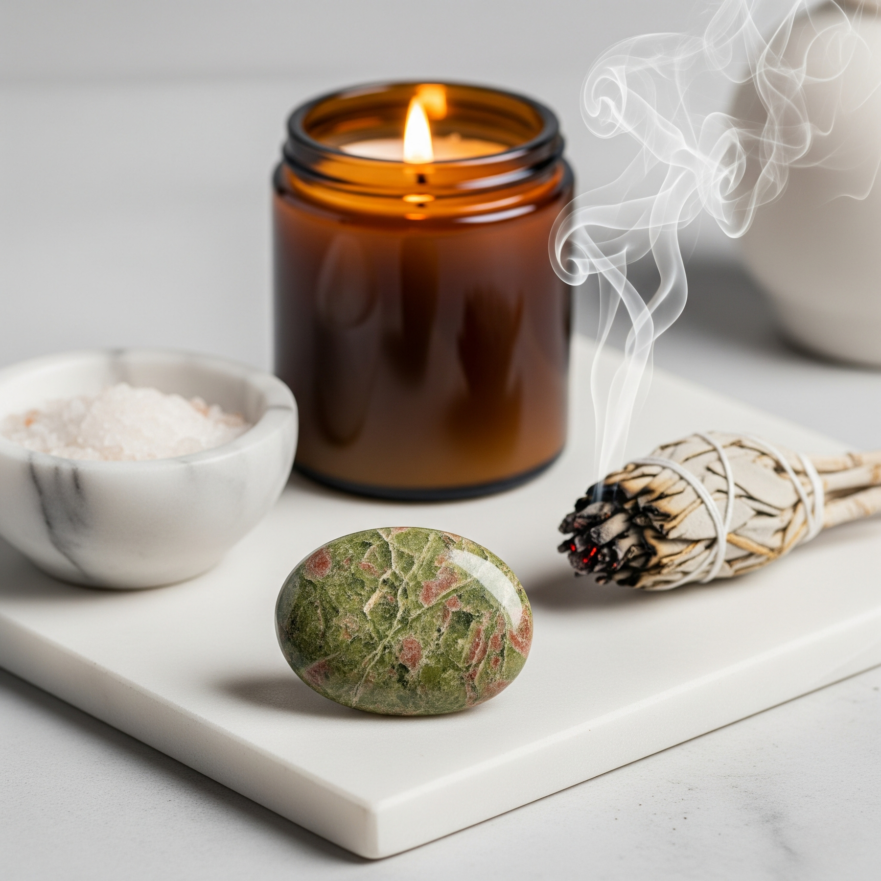 Noś kamień lub umieść go w stałym polu widzenia. Wracaj do intencji w momentach decyzyjnych. Świecę zapalaj, gdy chcesz wzmocnić efekt.