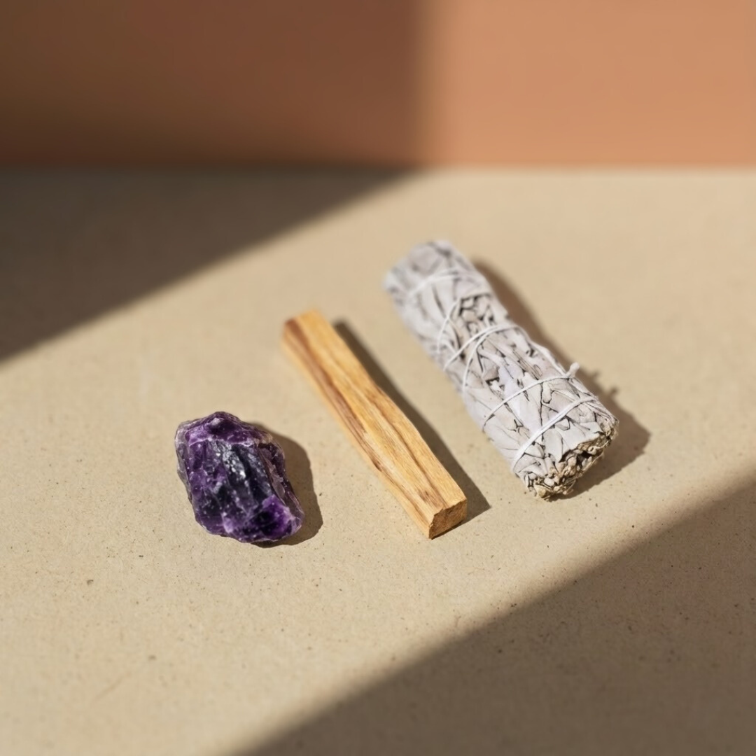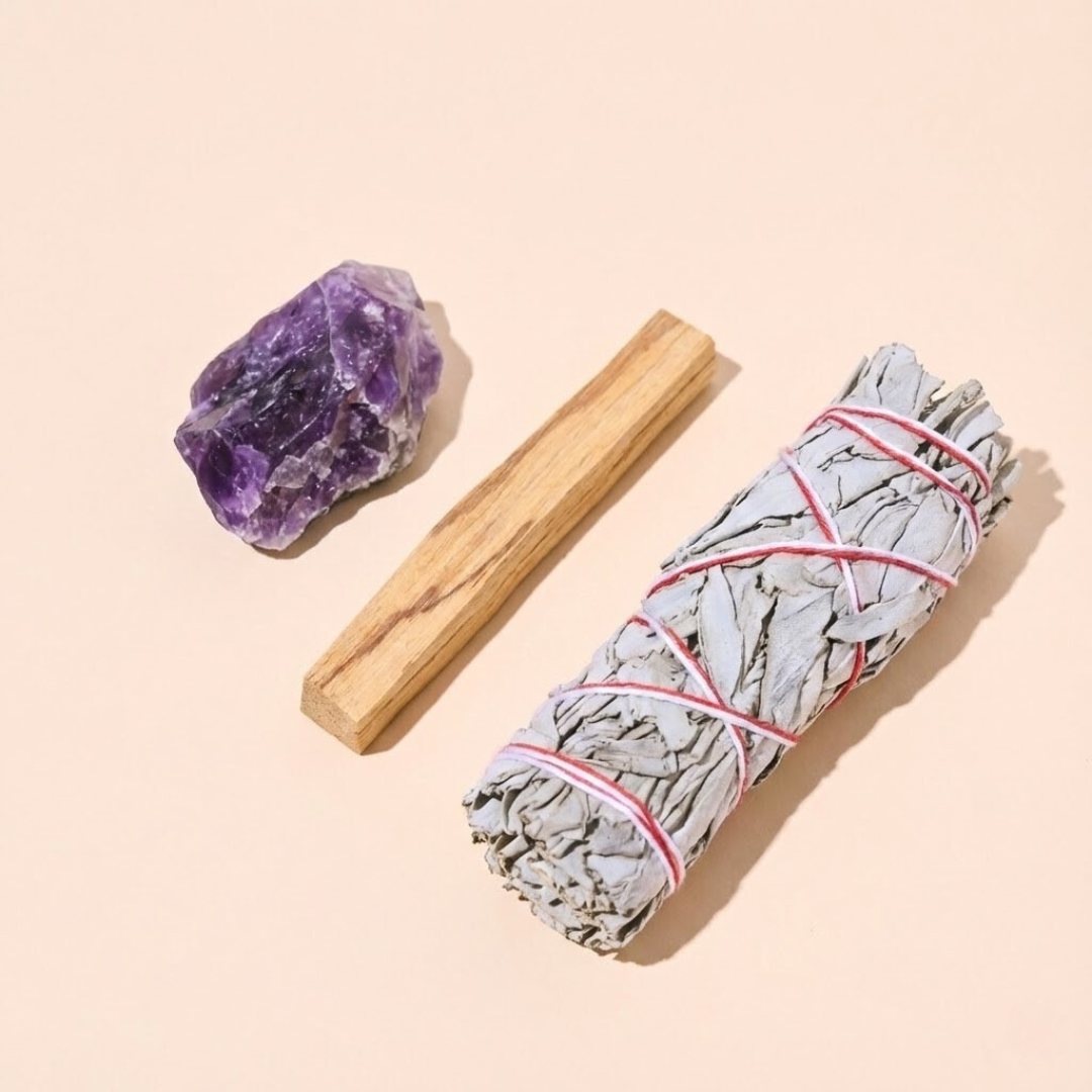 Zestaw Oczyszczający Energię – Ametyst z Szałwią Białą i Palo Santo